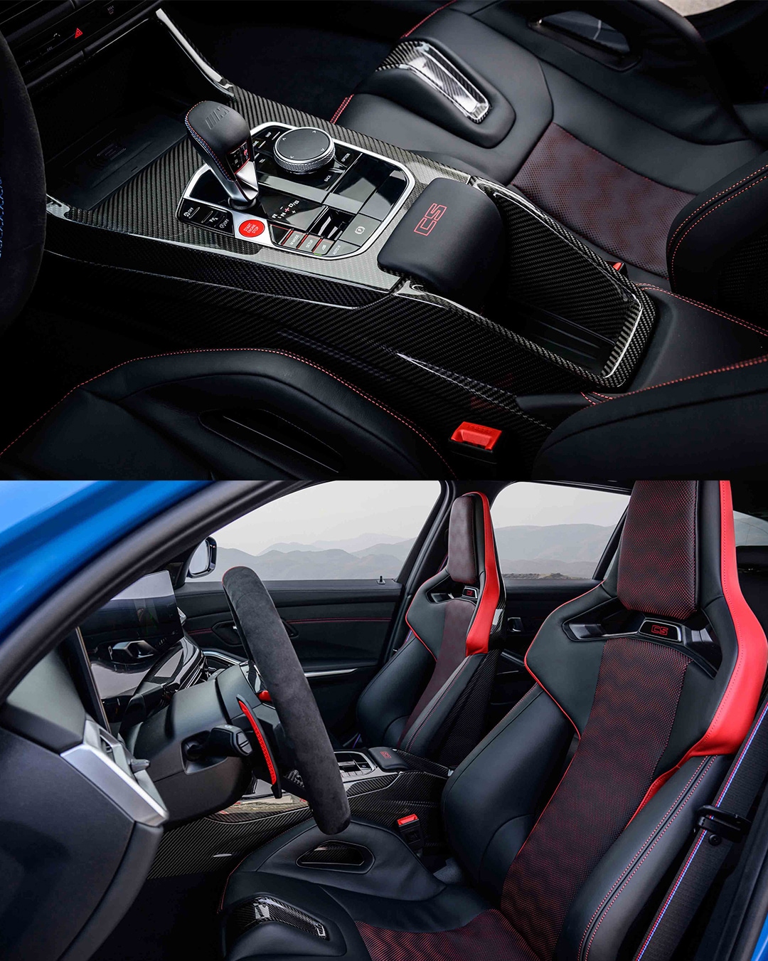 В салоне: Угле-волокно применили для создания центральной консоли, передней панели и рычага коробки передач — Фирменные кресла-ковши с электрорегулировками и подогревом — Руль отделан алькантарой и имеет красную отметку