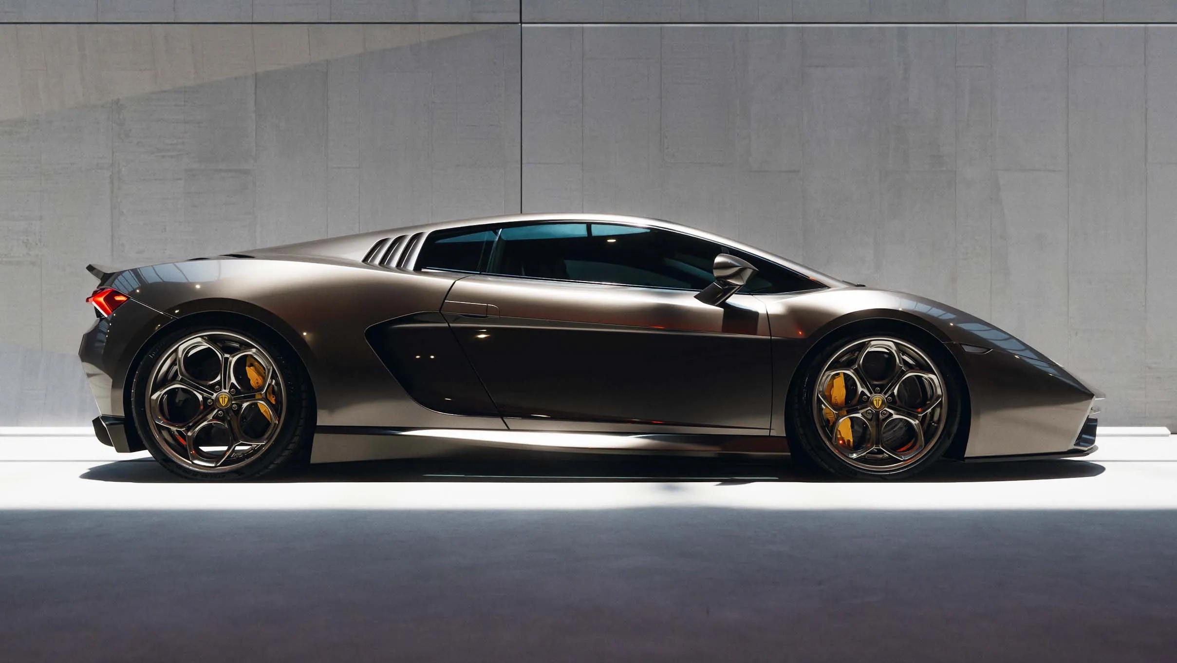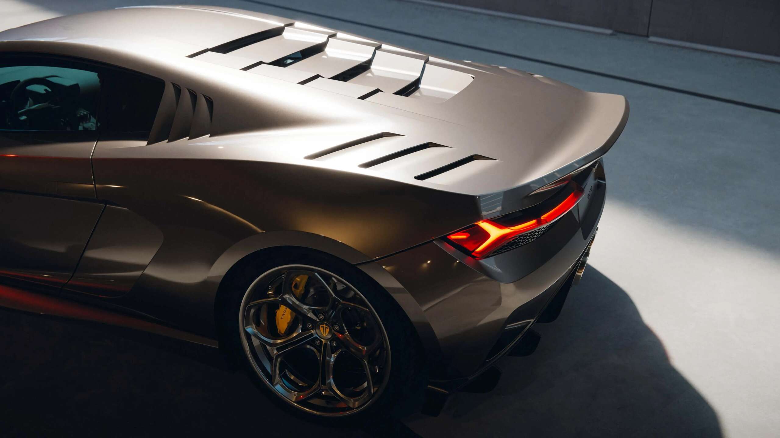 Задняя часть Etna выглядит даже более цельной, чем у нового Lamborghini Temerario. Установлена уникальная крышка двигателя с дополнительными вентиляционными отверстиями, стильный спойлер типа «утиный хвост» и современные светодиодные фонари, напоминающие задние огни Lamborghini Revuelto. Выпускные трубы переместили в центр, а бампер и диффузор полностью переработали.