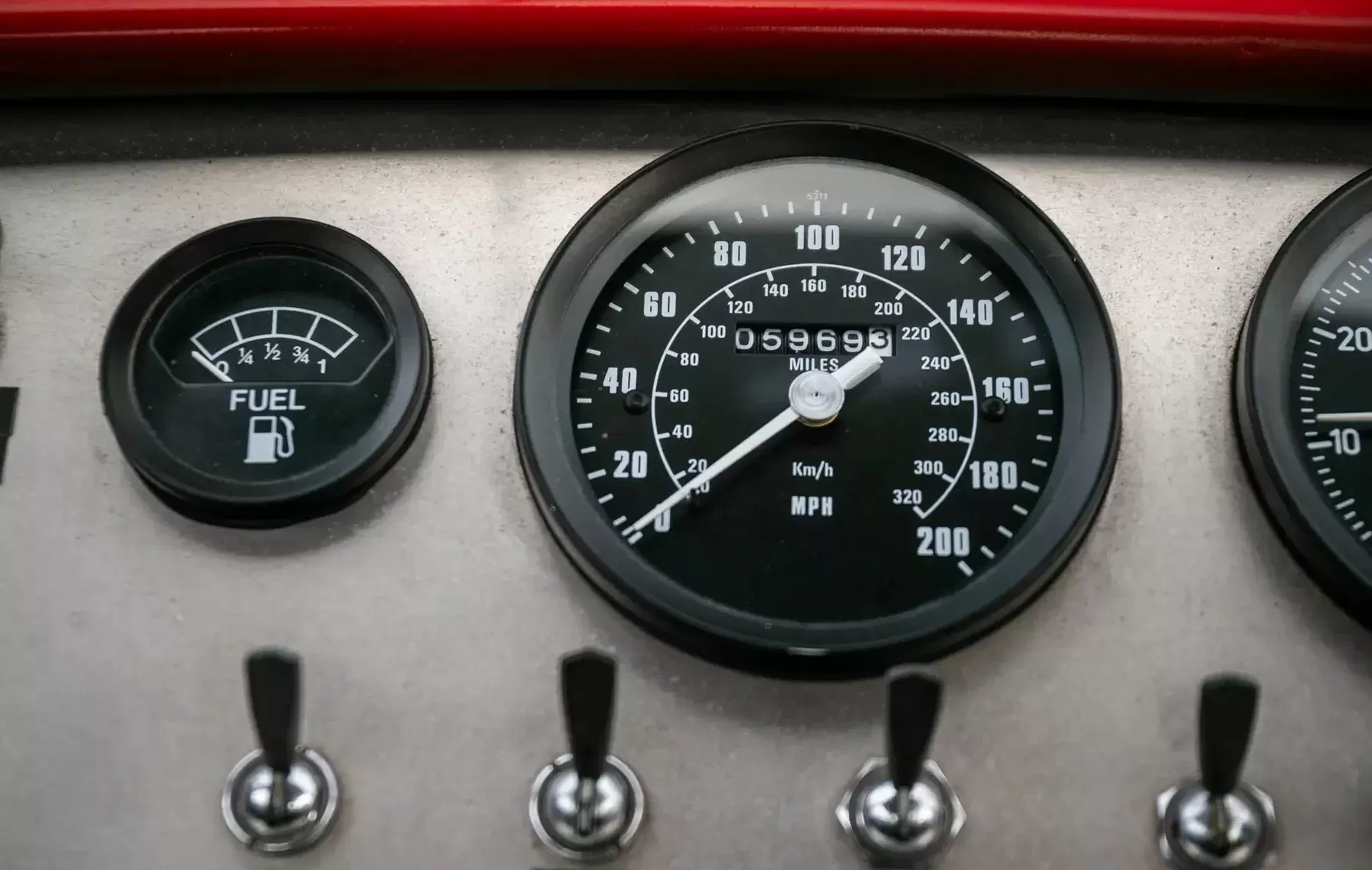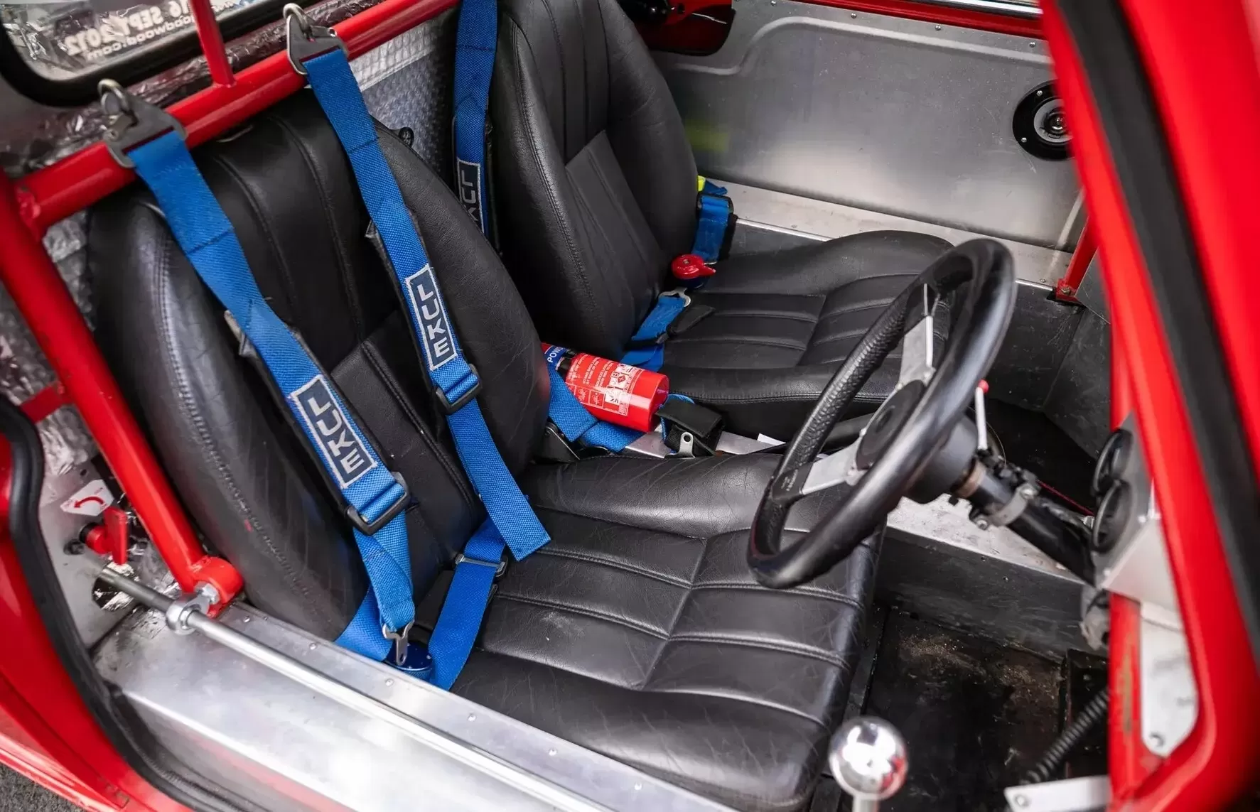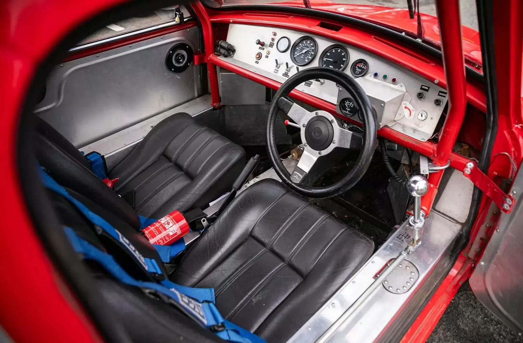Салон можно назвать спартанским: полукаркас безопасности, гоночные ремни, пара черных сидений и простой алюминиевый приборный щиток — вот и все удобства. Рычаг переключения передач расположен на пороге со стороны водителя, а открытая тяга идет прямо к задней части автомобиля.